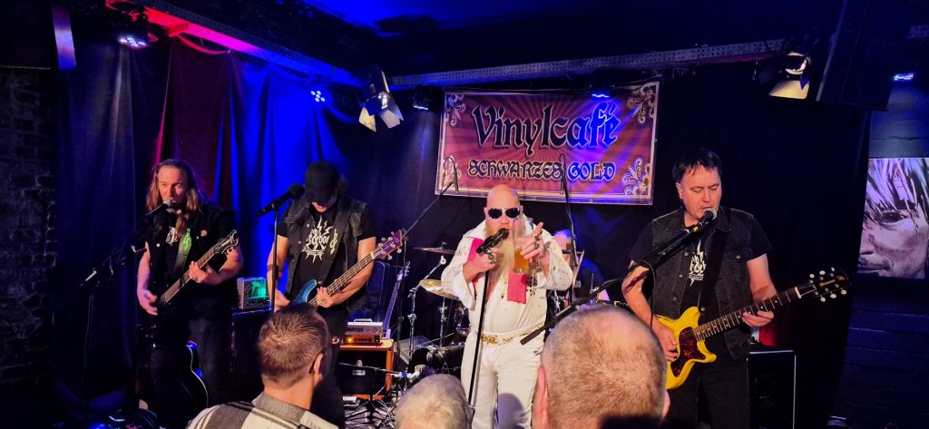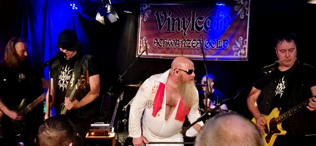 Gestartet wird mit dem Knaller „UR RNR“. Erst im Laufe des Songs kommt Frontröhre Vöhri in einem Elvis Presley Jumpsuit auf die Bühne, was alleine vom Outfit her für mächtig Stimmung sorgt. Während auf der Bühne vorsichtig das ein oder andere Bier getrunken wird, gibt es im Laden kein Halten mehr. Das Bier fließt in Strömen und mit jedem weiteren Song, den die Jungs aus dem wunderschönen Backnang (Baden-Württemberg) abfeuern, steigt die Stimmung unaufhaltsam.